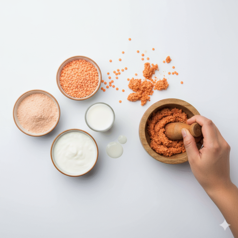 Take 2 tbsp Masoor Dal and soak them in raw milk/water for a few hours, until soft. Then grind it into a coarse paste.